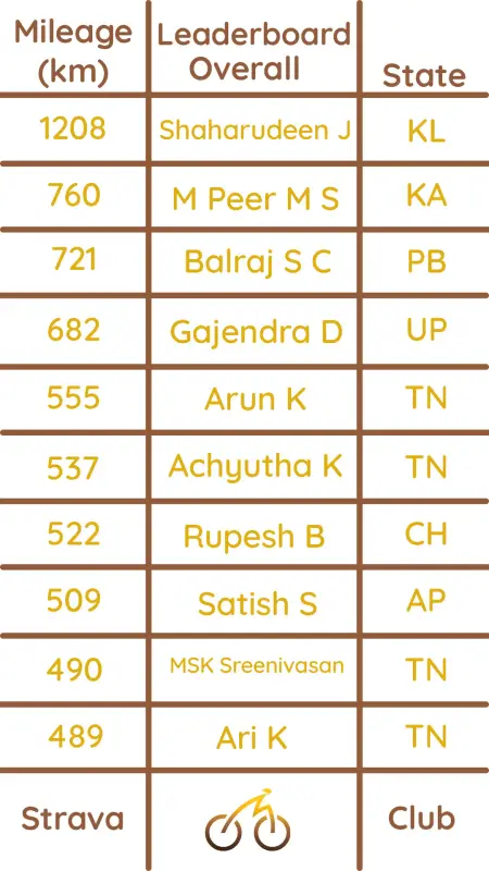 Shaharudeen J from Kerala was top of the charts. He rode an incredible 1208 km.