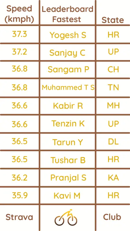 Fastest of the lot is Tenzin Kunchok from Uttar Pradesh who averaged an incredible 39 kmph over the week!
