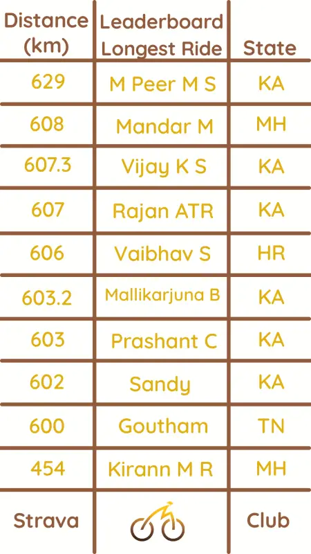 Top spot goes to M Peer Mohamed Sardhar from Karnataka for the longest ride. He did a 629 km long ride! He was second last week.