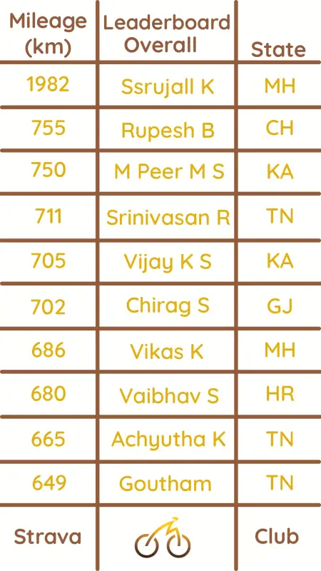 Achyutha Krishnan from Tamil Nadu was top of the charts. He rode an incredible 795 km.