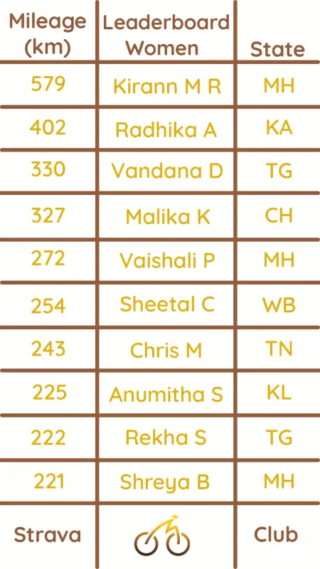 There are 9 women in the top 100 this week, 10 less than last week.Kirann MTB Rider from Maharashtra was top of the charts this week. Riding an incredible 579 km. She is 16th overall. She was third last week.