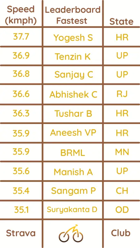 The top 76 have been riding at a seriously impressive pace.Fastest of the lot is Yogesh Saini from Haryana who averaged an incredible 37.7 kmph over the week! He was first last week as well.