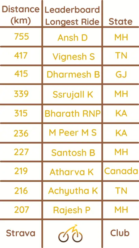 Rides this week coming in from around the country!Top spot goes to Ansh Dhopte from Maharashtra for the longest ride. He did a 755 km long ride!
