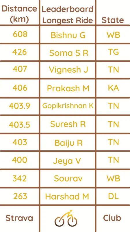 Rides this week coming in from around the country!Top spot goes to Bishnu Goenka from West Bengal for the longest ride. He did a 608 km long ride!
