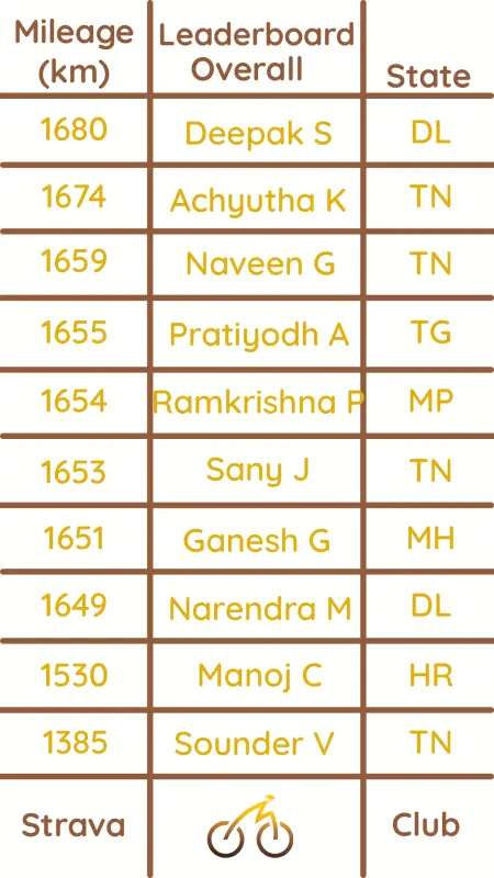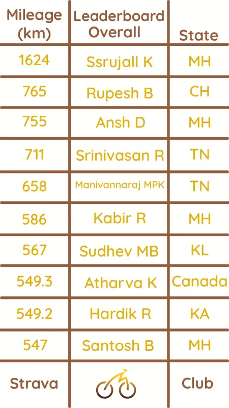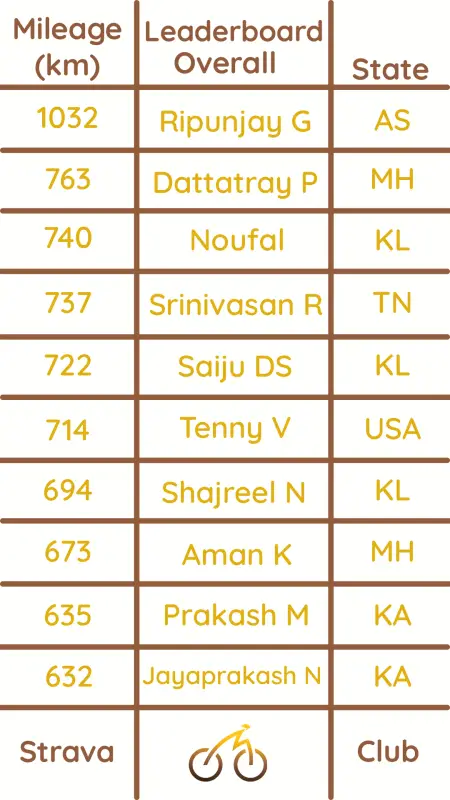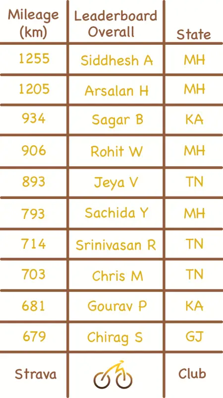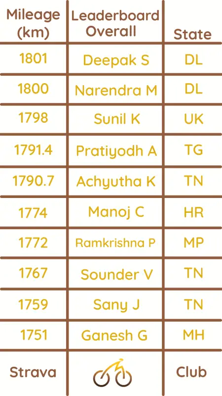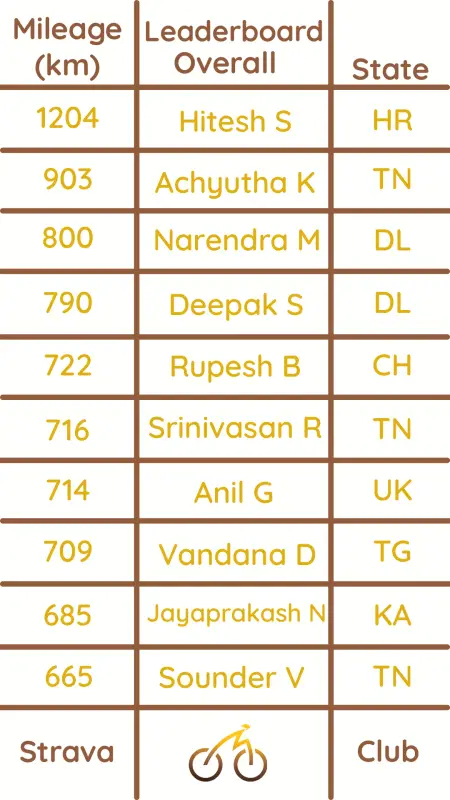 Ssrujall Kohale from Maharashtra was top of the charts. He rode an incredible 1624 km. He was first last week.