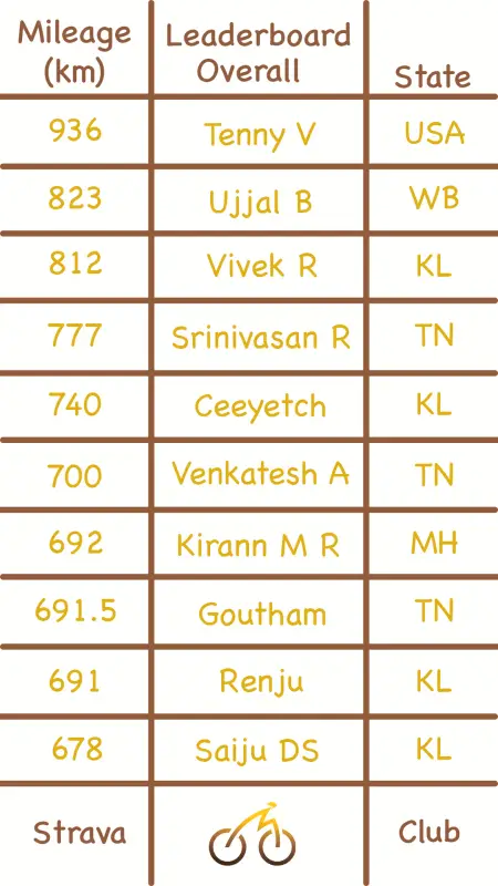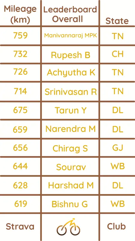 4 riders averaged more than 100 km a day!Manivannaraj MPK from Tamil Nadu was top of the charts. He rode an incredible 759 km.