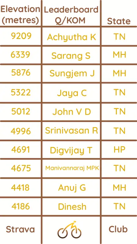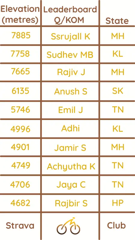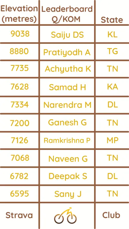 The climbing leaderboard went to the Western Ghats!Climber of the week is Saiju DS from Kerala having climbed 9038 metres.