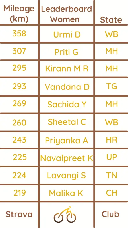 There are 15 women in the top 100 this week, 6 more than last week.Urmi Das from West Bengal was top of the charts this week. Riding an incredible 358 km. She is 28th overall.