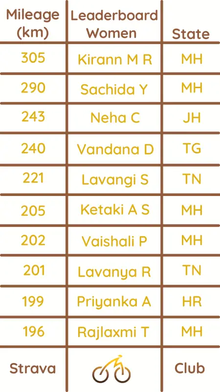 There are 13 women in the top 100 this week, 2 less than last week.Kirann MTB Rider from Maharashtra was top of the charts this week. Riding an incredible 305 km. She is 66th overall. She was third last week.