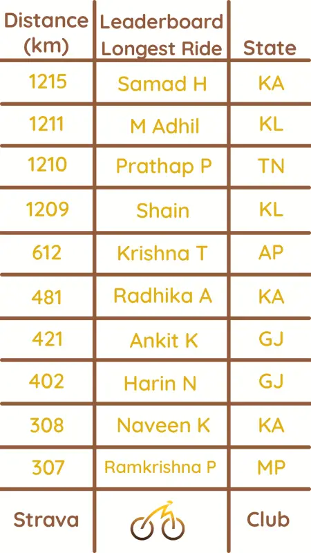 Rides this week coming in from around the country!Top spot goes to Samad Hanbal from Karnataka for the longest ride. He did a 1215 km long ride!