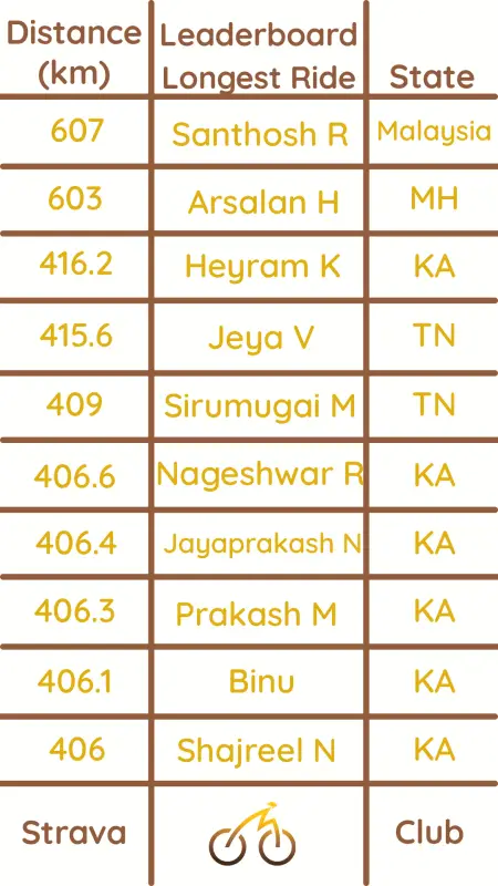 Rides this week coming in from the south of India!Top spot goes to Santhosh Reddy from Malaysia for the longest ride. He did a 607 km long ride!