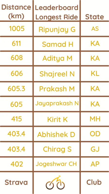 Rides this week coming in from around the country!Top spot goes to Ripunjay Gogoi from Assam for the longest ride. He did a 1005 km long ride!