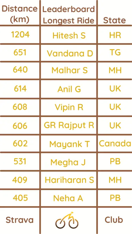 Rides this week coming in from around the country!Top spot goes to Hitesh Sablok from Haryana for the longest ride. He did a 1204 km long ride!