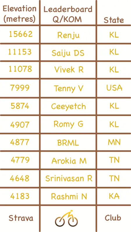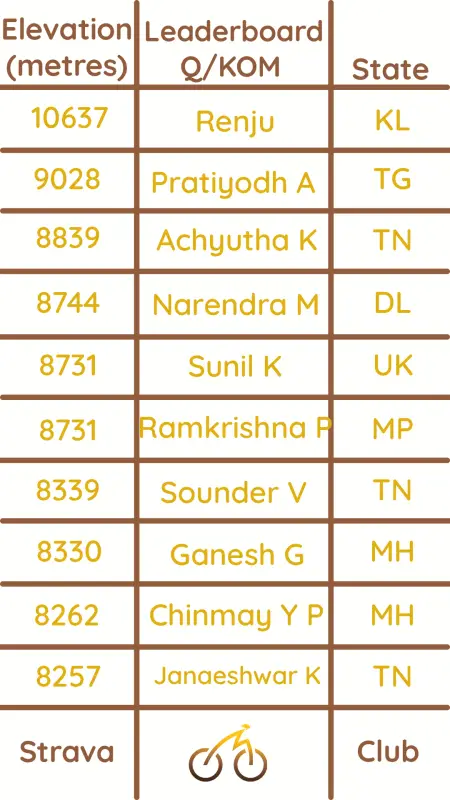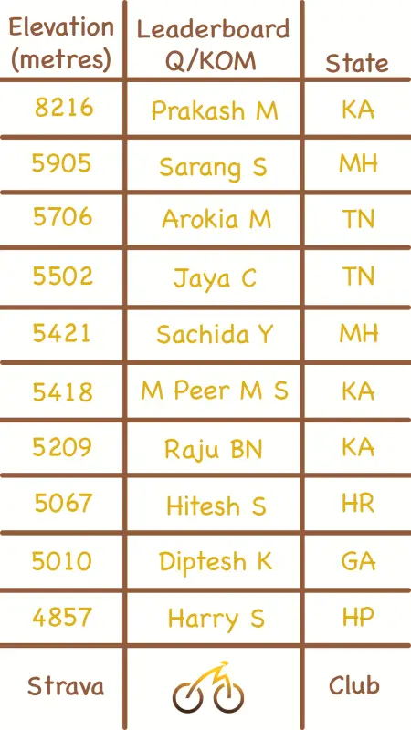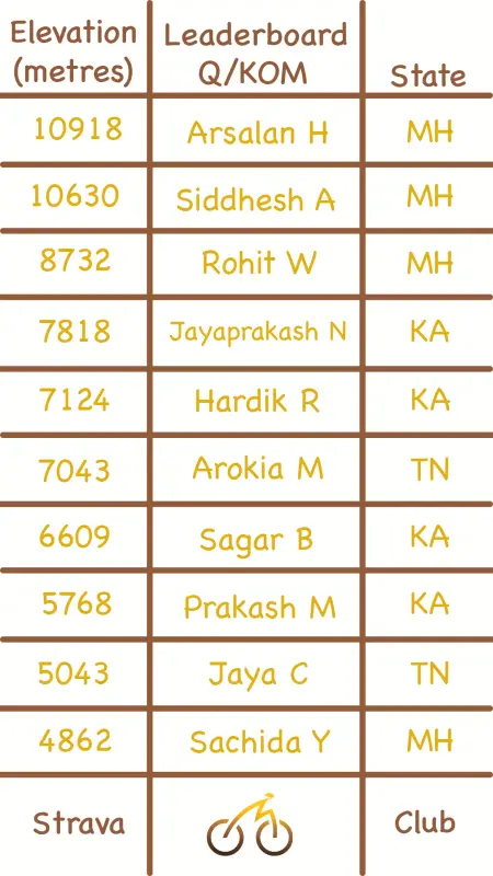 The climbing leaderboard went to the Western Ghats!Climber of the week is Prakash M from Karnataka having climbed 8216 metres.