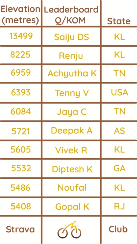 The climbing leaderboard went to the Western Ghats!Climber of the week is Saiju DS from Kerala having climbed 13499 metres.