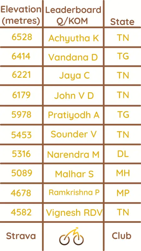 The climbing leaderboard went to all the Western Ghats!Climber of the week is Achyutha Krishnan from Tamil Nadu having climbed 6528 metres. He was first last week as well.
