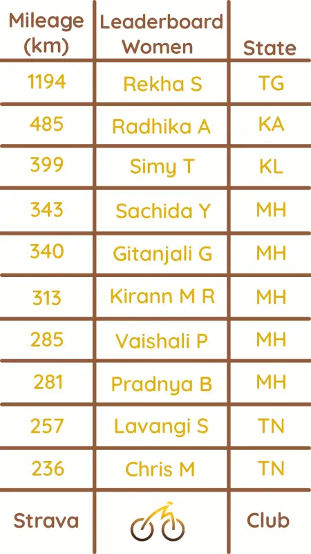There are 11 women in the top 100 this week, 2 less than last week.Rekha S from Telangana was top of the charts this week. Riding an incredible 1194 km. She is 19th overall. She was second last week.
