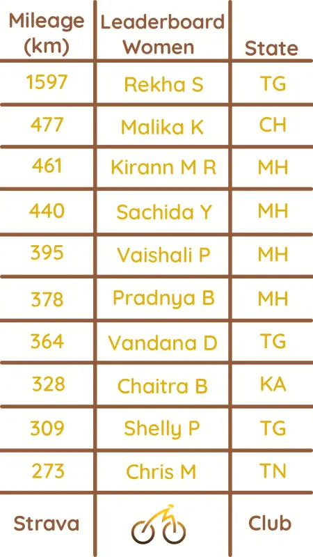 There are 13 women in the top 100 this week, 2 more than last week.Rekha S from Telangana was top of the charts this week. Riding an incredible 1597 km. She is 13th overall. She was first last week.