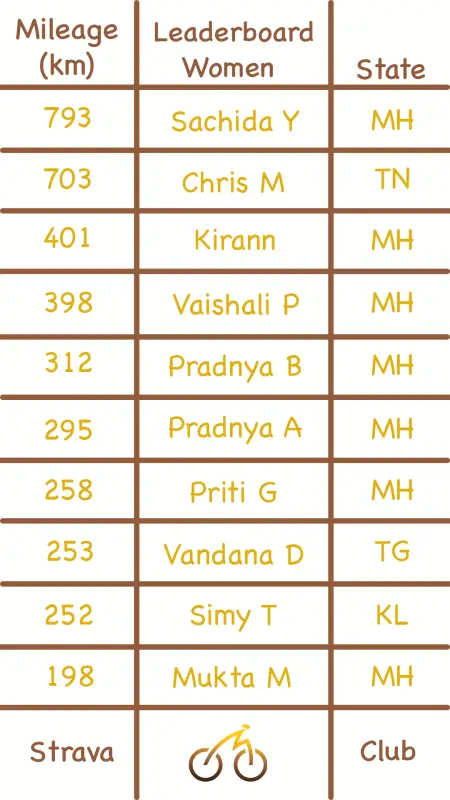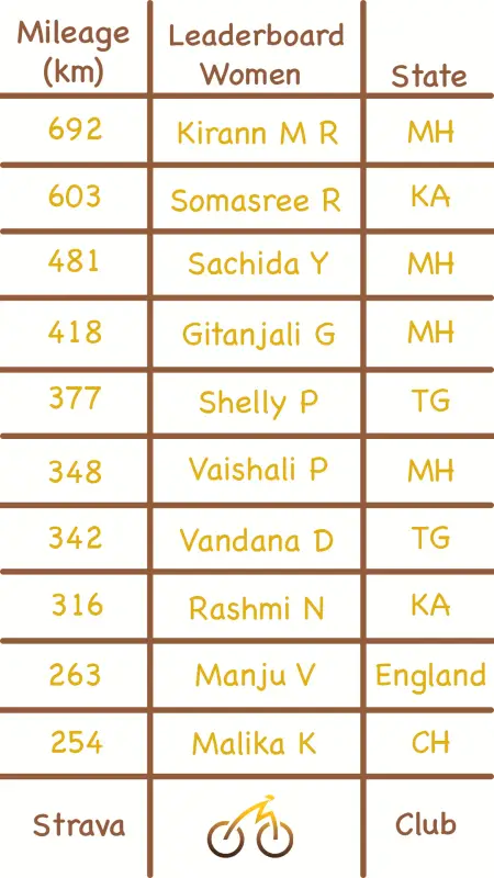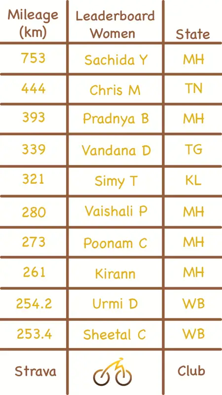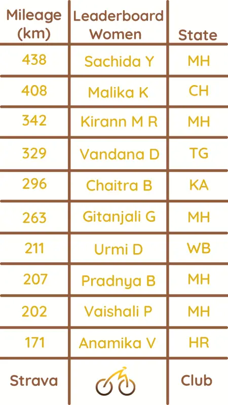 There are 9 women in the top 100 this week, 4 less than last week.Sachida Yadav from Maharashtra was top of the charts this week. Riding an incredible 438 km. She is 39th overall.