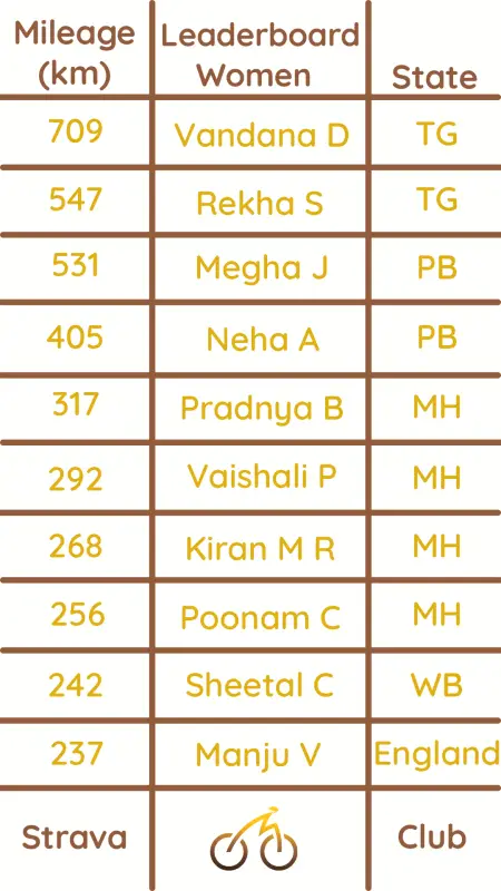 There are 13 women in the top 100 this week, same as last week. Vandana Dhavate from Telangana was top of the charts this week. Riding an incredible 709 km. She is 8th overall.Next up is Rekha S from Telangana. Who rode an impressive 547 km. She is 26th overall.