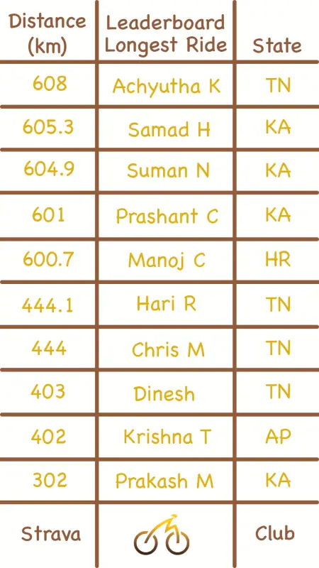 Rides this week coming in from around the country!Top spot goes to Achyutha Krishnan from Tamil Nadu for the longest ride. He did a 608 km long ride!
