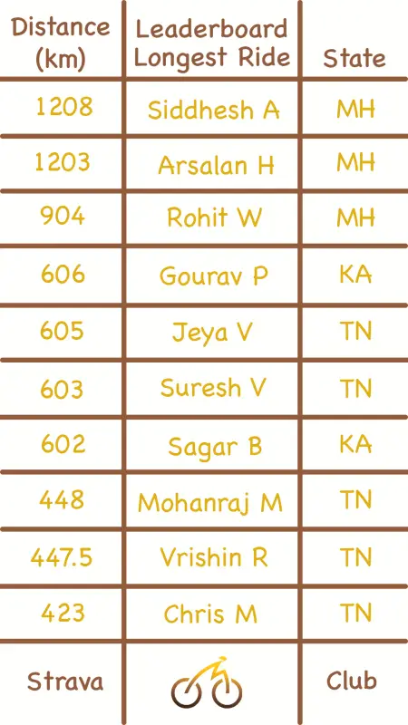Rides this week coming in from around the country!Top spot goes to Siddhesh Adivarekar from Maharashtra for the longest ride. He did a 1208 km long ride!
