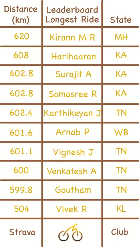 Third is Suman N from Karnataka, who did a 604.9 km long ride.