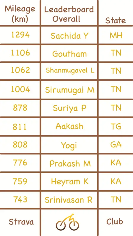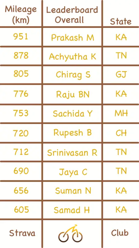 7 riders averaged more than 100 km a day!Prakash M from Karnataka was top of the charts. He rode an incredible 951 km.