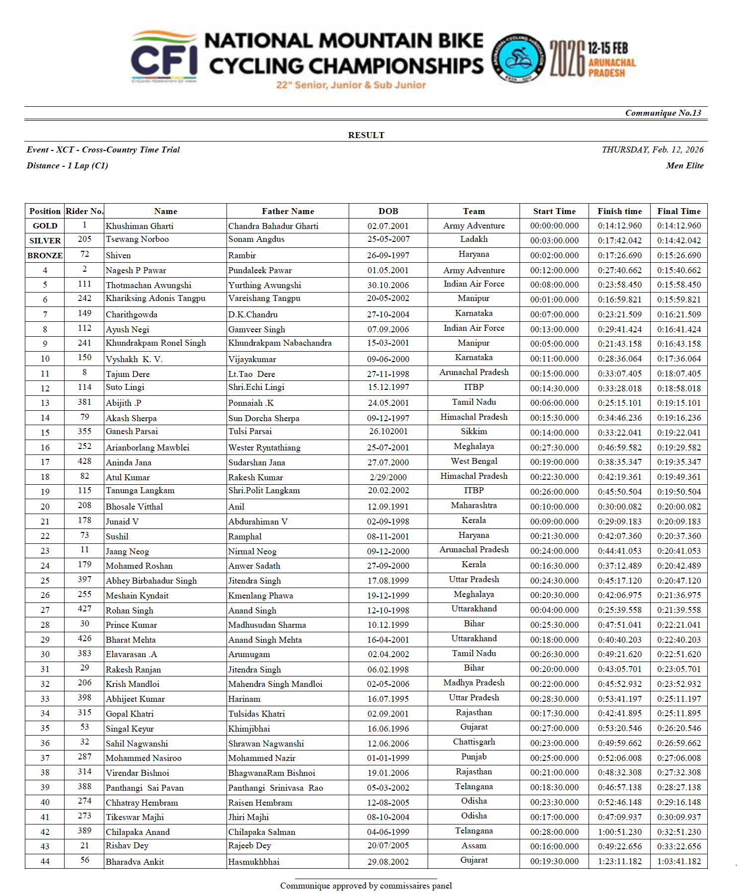 The Men’s Elite XCT was won by Khushiman Gharti from the Army Adventure Wing as he completed the single lap TT in 14 minutes and 12 seconds. Second place was taken by 19-year-old Tsewang Norboo from Ladakh as he finished 30 seconds behind. The podium spots were rounded off by veteran Indian mountainbiker Shiven from Haryana as he finished another 44 seconds adrift.