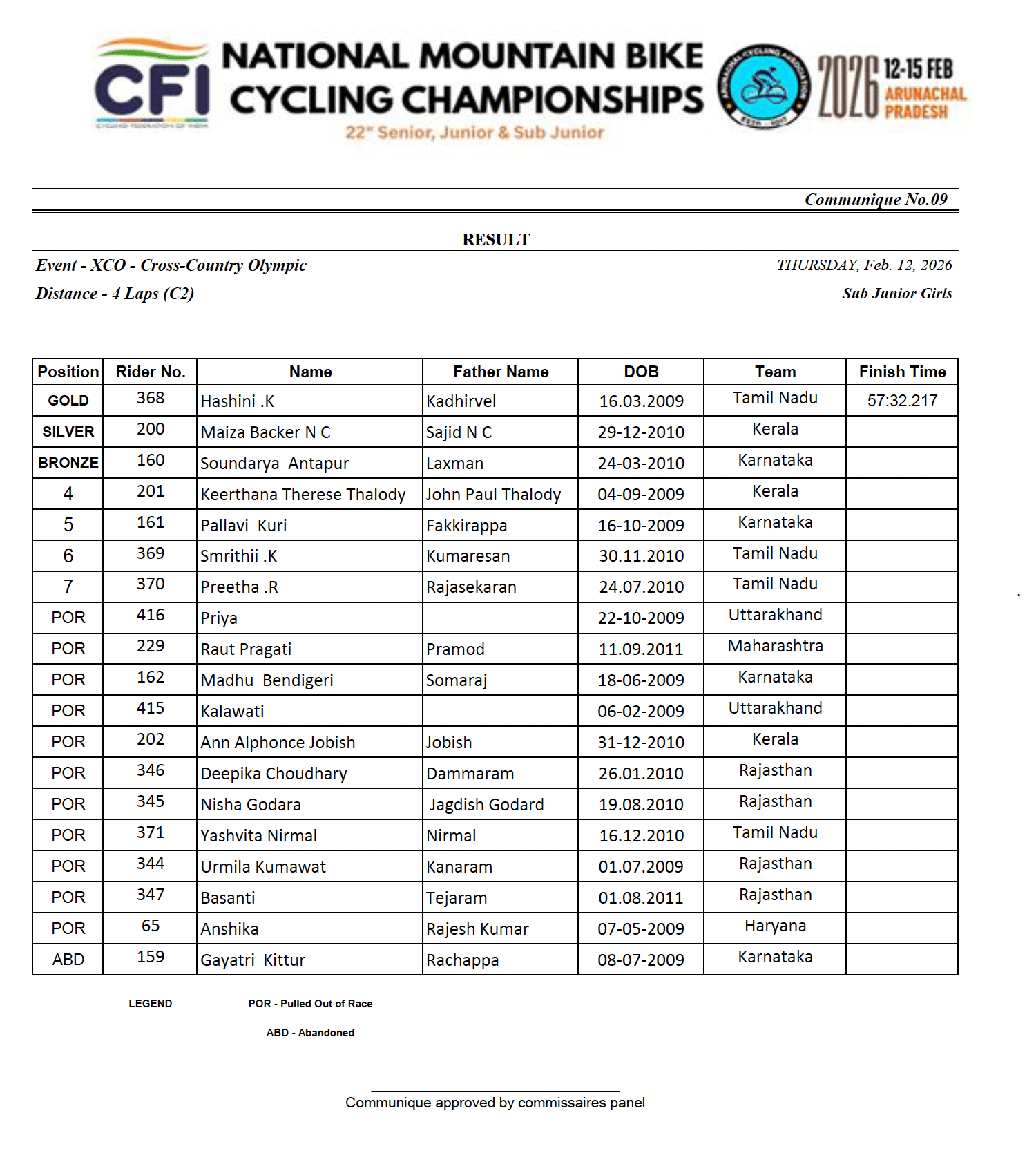 Hashini K from Tamil Nadu took the win in the XCO for sub-junior girls. She was joined on the podium by Maiza Backer NC from Kerala and Soundarya Antapur from Karnataka on the 4 lap course, in a race which lasted 57 minutes.