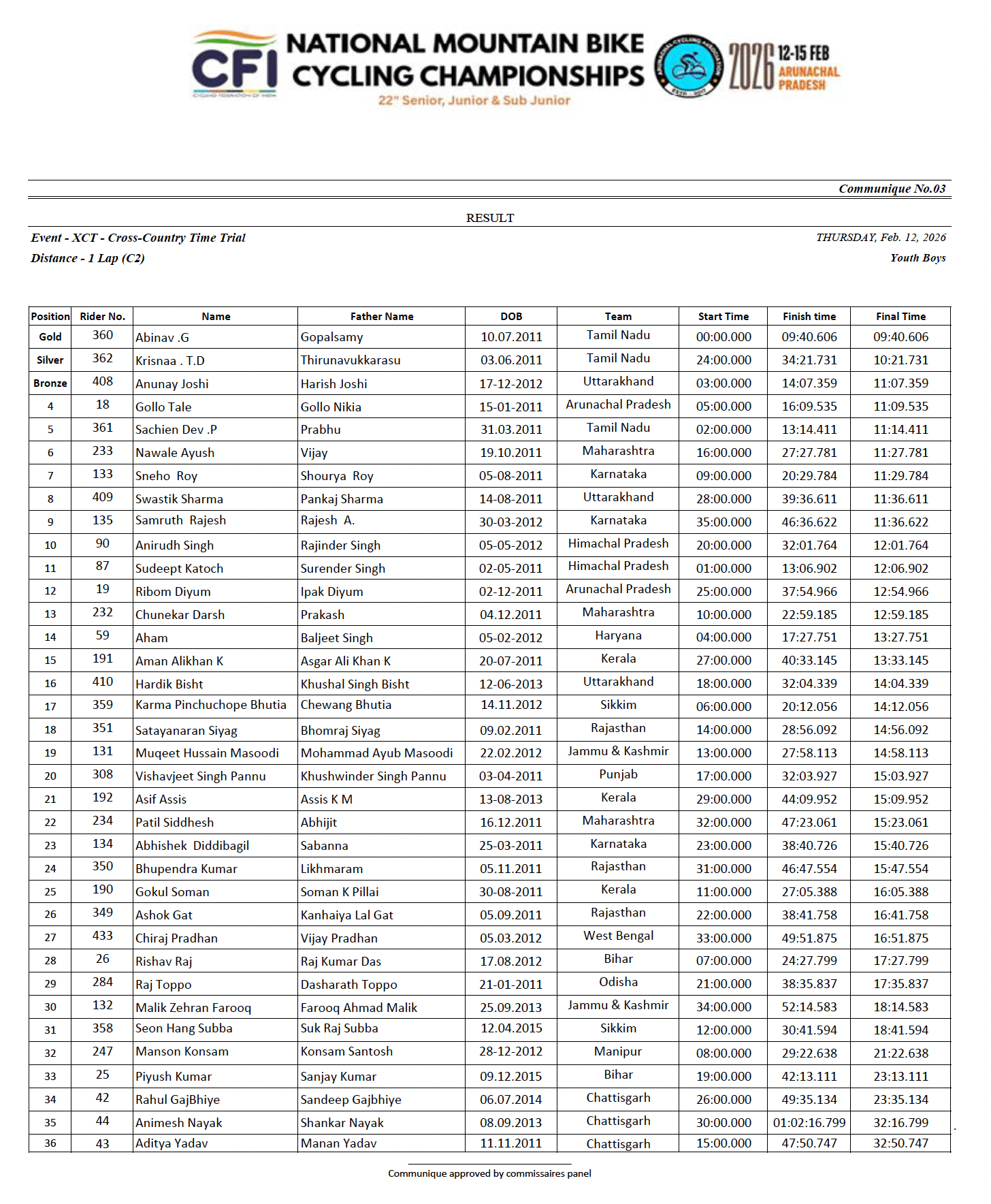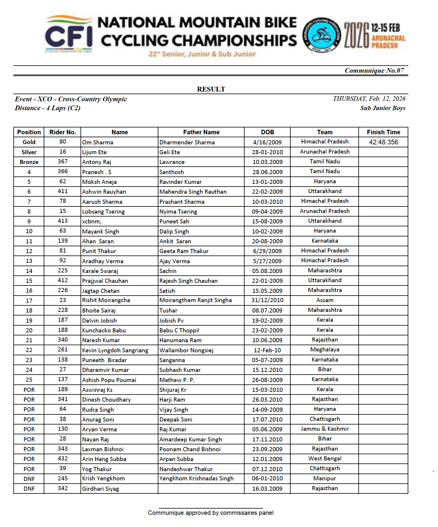 Om Sharma from Himachal Pradesh took the win in XCO sub-junior boys. He won the 4 lap race in 42 minutes. Local boy Lijum Ete from Arunachal Pradesh took silver in his home race and Antony Raj from Tamil Nadu took the final place on the podium.