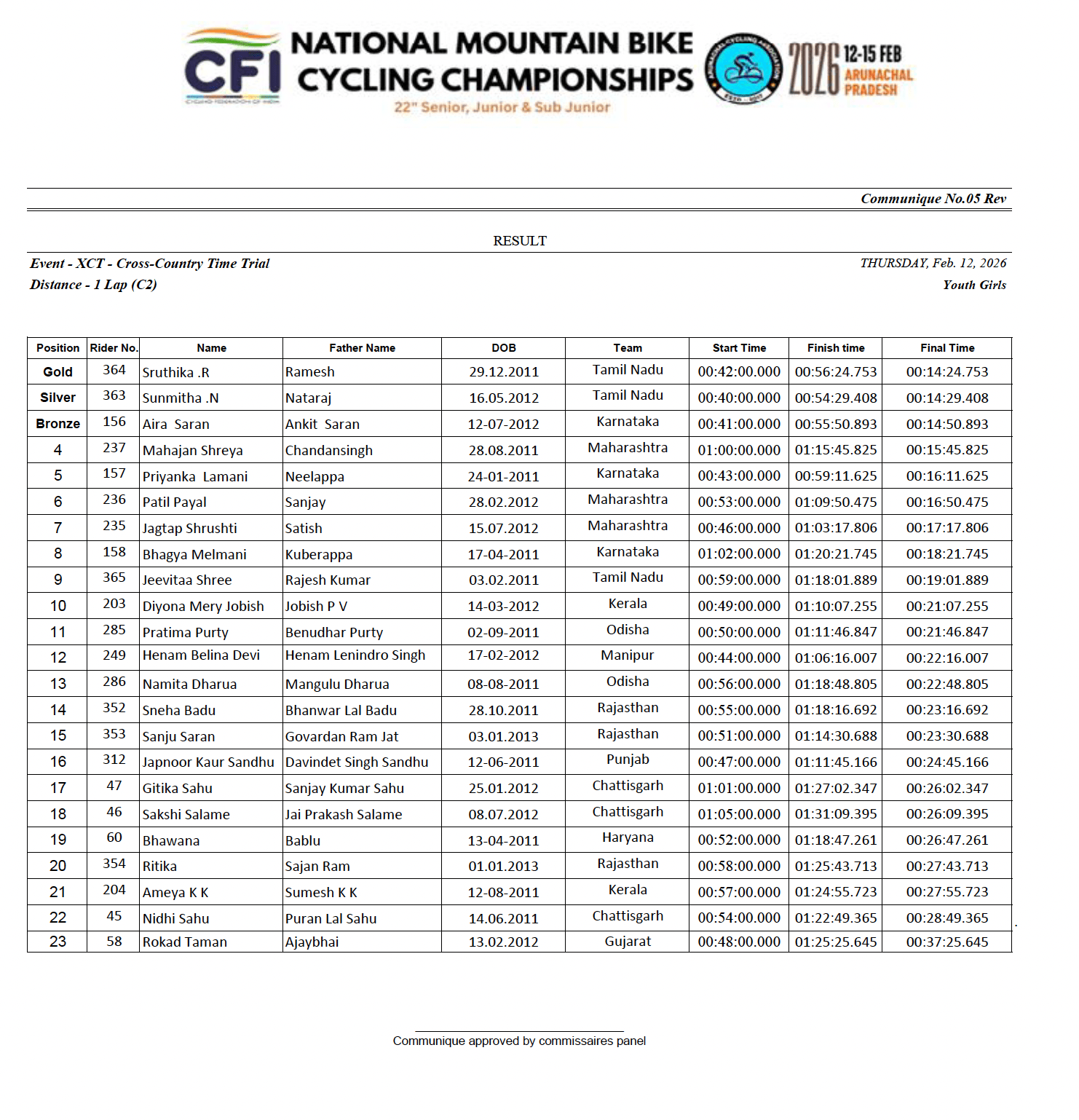 Sruthika R from Tamil Nadu took the win in the XCT youth girls category by finishing the course in 14 minutes and 24 seconds. She was joined by teammate Sunmitha N who was just 5 seconds slower. Bronze was won by Aira Saran from Karnataka and she was another 21 seconds adrift.