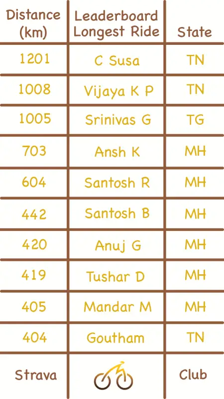 Rides this week coming in from around the country!Top spot goes to Vibhav Shinde from Maharashtra for the longest ride. He did a 1009 km long ride!