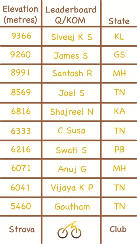 The climbing leaderboard went to the Western Ghats!Climber of the week is Prakash M from Karnataka having climbed 8216 metres.