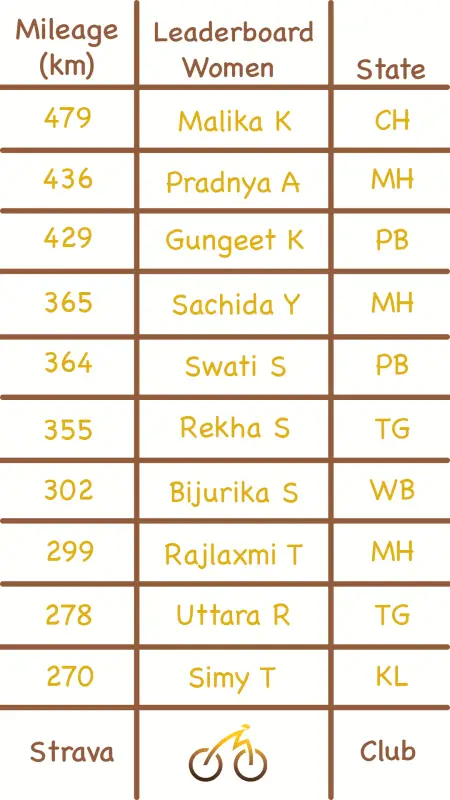 There are 13 women in the top 100 this week, 2 more than last week.Sachida Yadav from Maharashtra was top of the charts this week. Riding an incredible 467 km. She is 30th overall. She was first last three weeks as well.