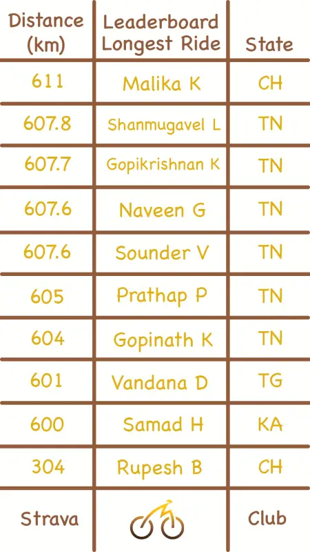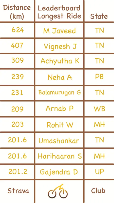 Top spot goes to Mohamed Javeed from Tamil Nadu for the longest ride. He did a 624 km long ride!