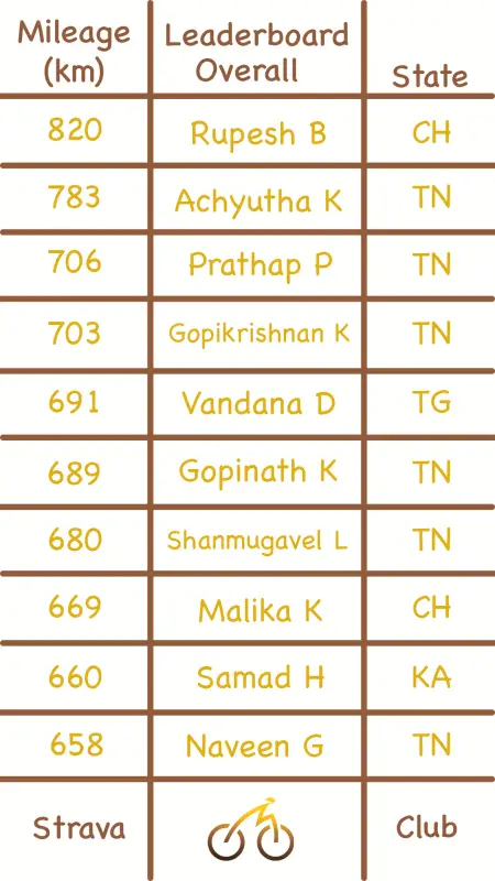 2 riders averaged more than 100 km a day!Achyutha Krishnan from Tamil Nadu was top of the charts. He rode an incredible 968 km.In second place is Vignesh J from Tamil Nadu who rode 758 km in the week.Third spot is taken by Umashankar from Tamil Nadu. He rode 679 km.Leaderboard: Women