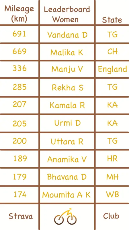 There are 13 women in the top 100 this week, 2 less than week.Vandana Dhavate from Telangana was top of the charts this week. Riding an incredible 691 km. She is 5th overall. She was third last week.