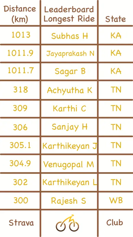 Top spot goes to Subhas Hangaraki from Karnataka for the longest ride. He did a 1013 km long ride!