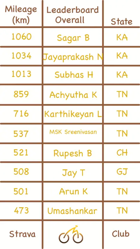 Ganesh M from Tamil Nadu was top of the charts. He rode an incredible 848 km.
