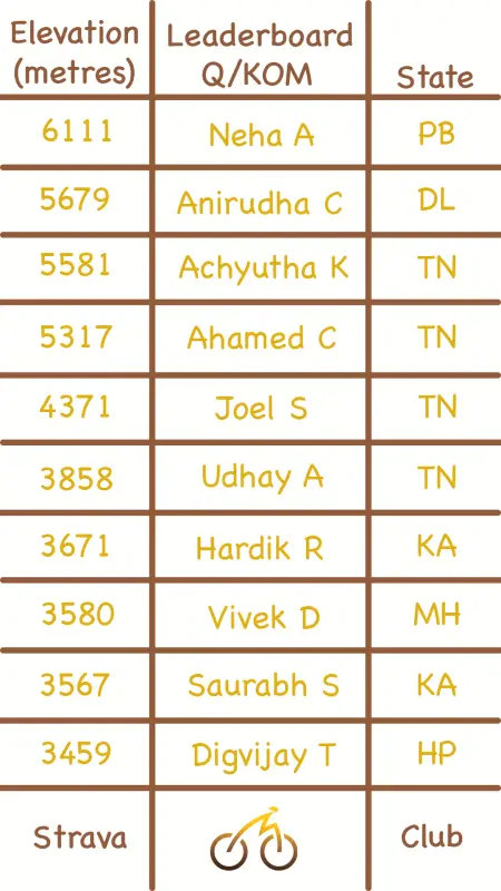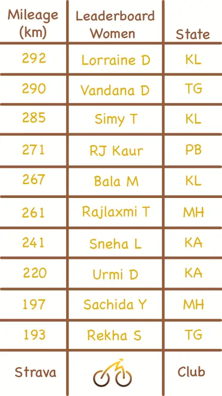 There are 13 women in the top 100 this week, same as last week.Lorraine D’costa from Kerala was top of the charts this week. Riding an incredible 292 km. She is 69th overall.