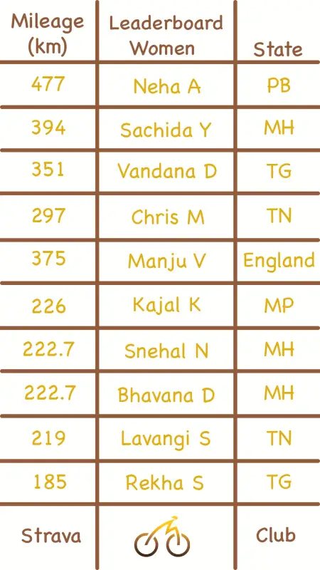 There are 15 women in the top 100 this week, same as last week.Neha Agarwaal from Punjab was top of the charts this week. Riding an incredible 477 km. She is 10th overall.